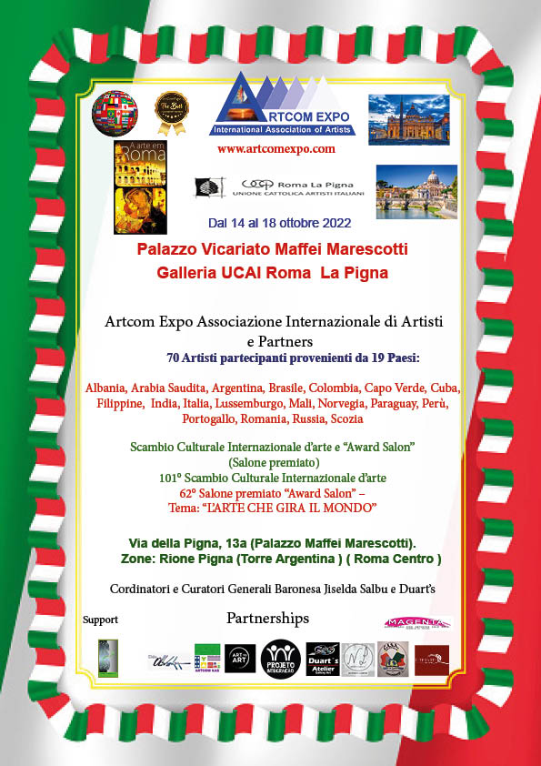 Roma La Pigna 2022 Artcom Dal 14 al 18 ottobre 2022 Palazzo Vicariato Maffei Marescotti Galleria UCAI Roma La Pigna Artcom Expo Associazione Internazionale di Artisti e Partners 70 Artisti partecipanti provenienti da 19 Paesi : Albania, Arabia Saudita, Argentina, Brasile, Colombia, Capo Verde, Cuba, Filippine, India, Italia, Lussemburgo, Mali, Norvegia, Paraguay, Perù, Portogallo, Romania, Russia, Scozia Artcom Expo Associazione Internazionale di Artisti e Partners Scambio Culturale Internazionale d'arte e “Award Salon” (Salone premiato) 101° Scambio Culturale Internazionale d'arte 62° Salone premiato “Award Salon” – Tema: “L’ARTE CHE GIRA IL MONDO” Cordinatori e Curatori Generali Baronesa Jiselda Salbu e Duart's